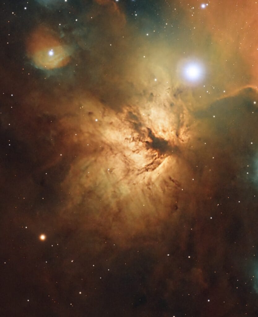 When you frame the Horsehead region wide enough, as in the image above, the Flame Nebula (NGC 2024) often comes along for the ride. The Flame is an emission nebula and active star-forming region, so it brings that “glowing gas” look back into the same field as the Horsehead’s dark dust. It’s a great contrast in one shot, with bright structure right next to the dark silhouette of the Horsehead.
