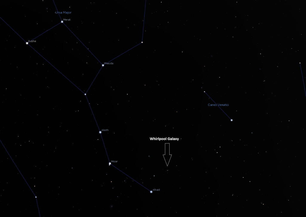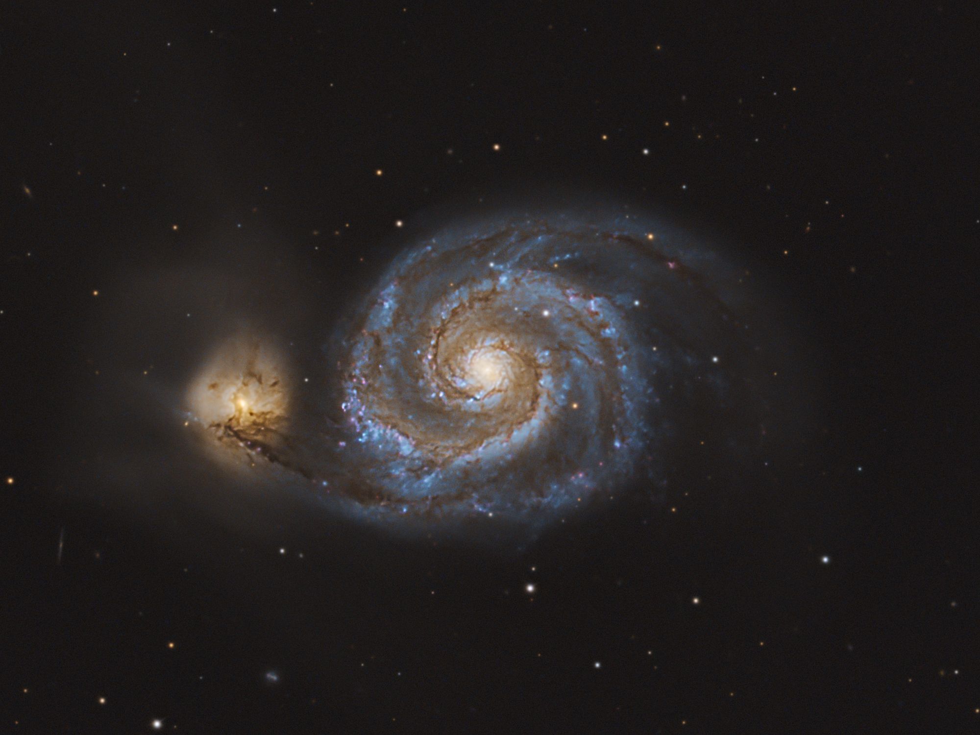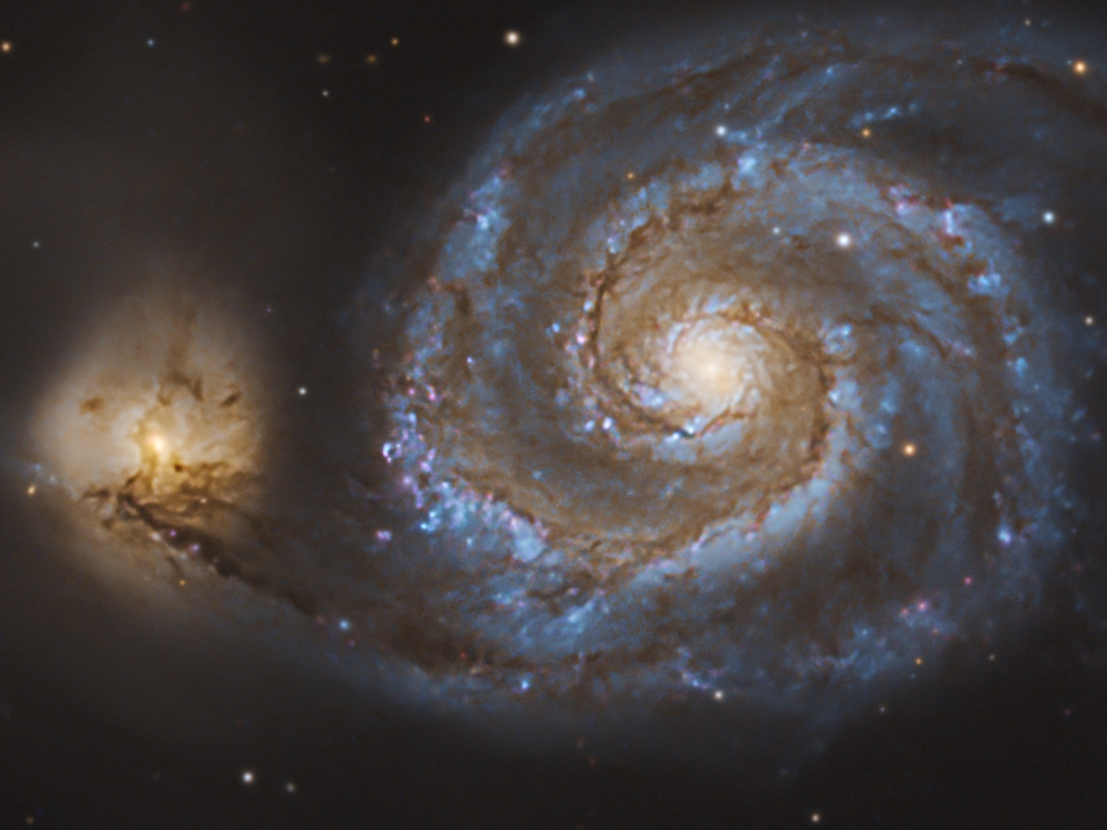 Located about 23 million light-years away in the constellation Canes Venatici, sitting just above the asterism of the Big Dipper’s handle, it was first recorded by Charles Messier in 1773. Two sweeping arms wrap around a bright core, with a smaller companion galaxy, NGC 5195, hanging just off one side and gravitationally tugging at those arms.